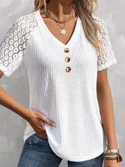 Button Front Lace Short Sleeve T-shirt, Elegant Solid V Neck Comfy T-shirt, Women's Clothing