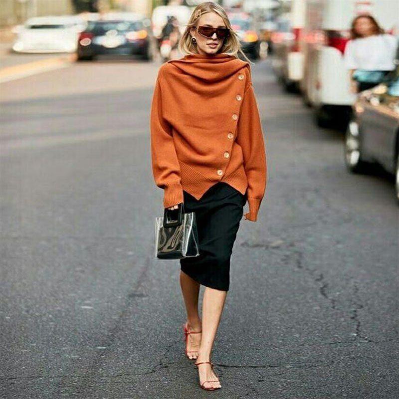 High Collar Single Breasted Solid Color Sweater Women